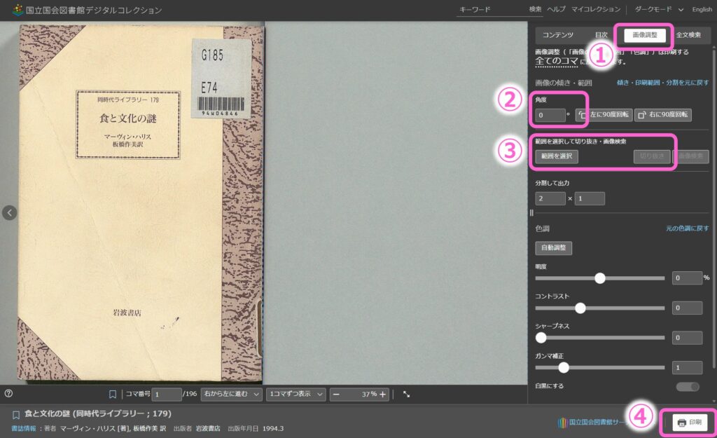 ②書籍のスキャン時に水平になるように調整されていますがズレているものもあり、気になれば角度を調整しましょう。角度はプラスマイナス/小数で指定することができます(1°回転させるだけでも大きく変化します)