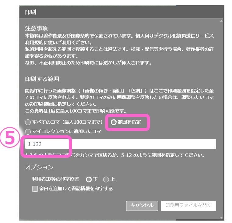 ⑤印刷範囲(ページ数)を選択します最大100コマ(枚)分をPDF化することができます。